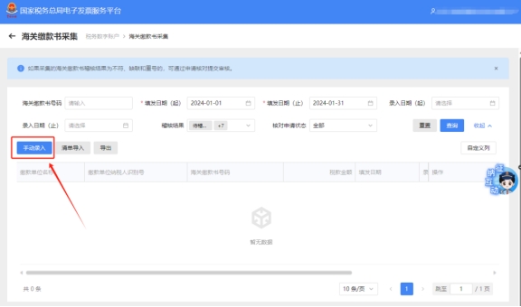 三、海關(guān)繳款書(shū)采集,點(diǎn)擊手動(dòng)錄入。
