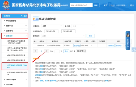 在電子稅務(wù)局上如何打印代開增值稅專用發(fā)票(自助機)的清單?  答、您好,請點擊【我要辦稅】—【發(fā)票使用】—【發(fā)票代開】—【代開增值稅專用發(fā)票(自助機)】,在申請記錄列表里,點擊后端【清單打印】選項?! D示指引如下  一、我要辦稅—發(fā)票使用?! ?.