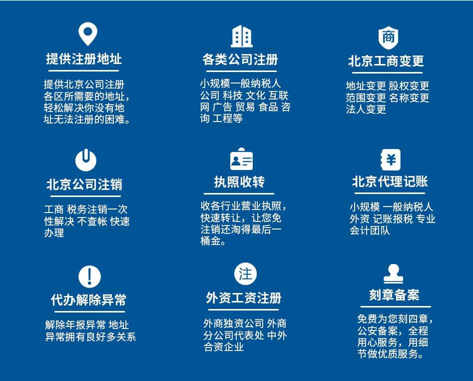 北京注冊公司流程及費用我都整理好啦!代辦個體公司營業(yè)執(zhí)照辦理,提供北京公司注冊地址,正規(guī)公司注冊代辦代理記賬公司,公司變更,股權(quán)變更,公司注銷轉(zhuǎn)讓一站式優(yōu)質(zhì)服務(wù)。