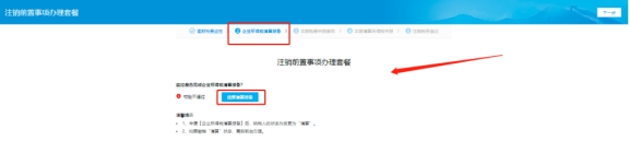 第五步:可點(diǎn)擊【我要清算申報(bào)】申報(bào)完成后,可點(diǎn)擊⑤或下一步按鈕再次進(jìn)入注銷預(yù)檢,對(duì)未辦結(jié)事項(xiàng)進(jìn)行檢測(cè),如果沒(méi)有未辦結(jié)事項(xiàng),則可以進(jìn)行注銷。